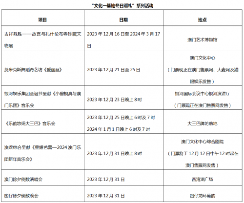 由文化局主办,澳门特别行政区政府旅游局、澳门特别行政区政府市政署及澳门广播电视股份有限公司协办,并由澳娱综合度假股份有限公司呈献烟花表演的“2023澳门除夕倒数演唱会”和“2023凼仔除夕倒数晚会”将于12月31日晚上,分别在澳门西湾湖广场和凼仔龙环葡韵举行,透过演出促进演艺交流。