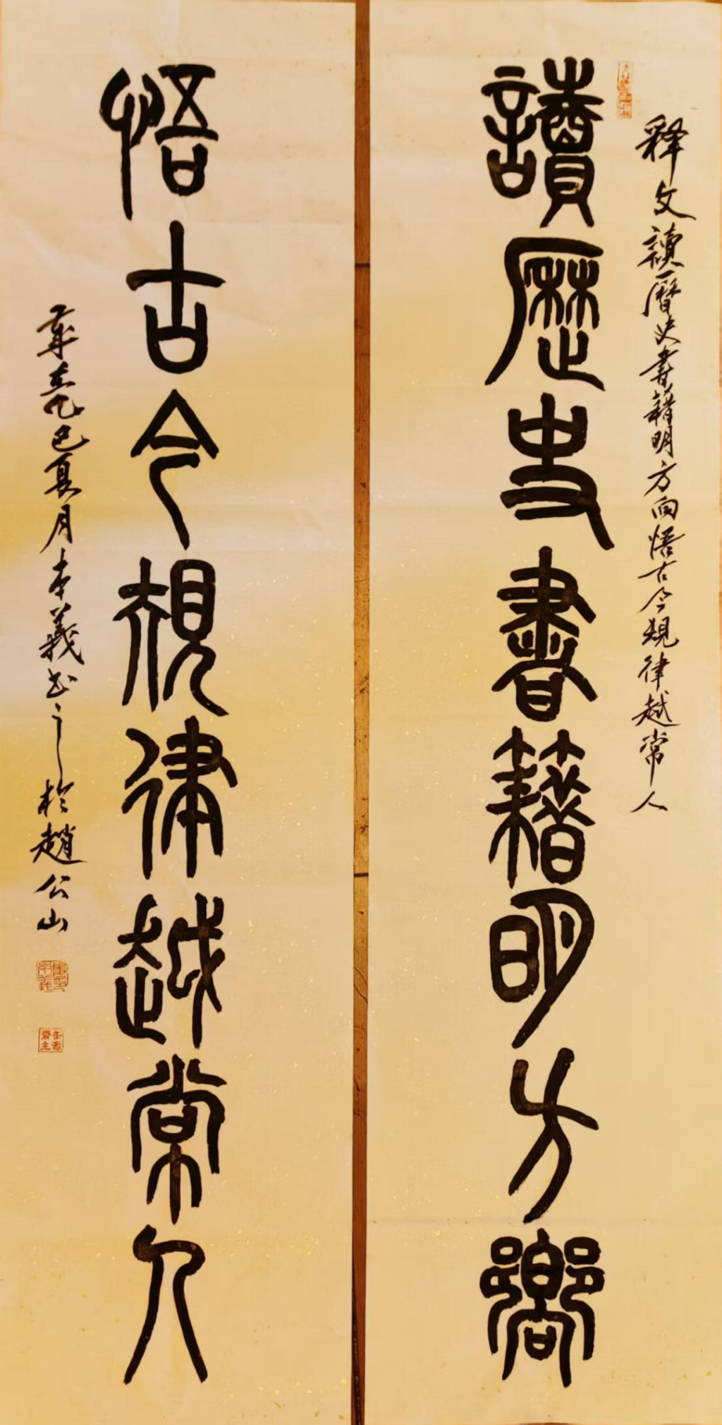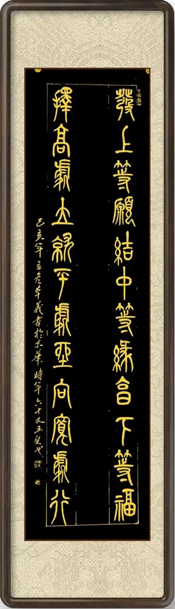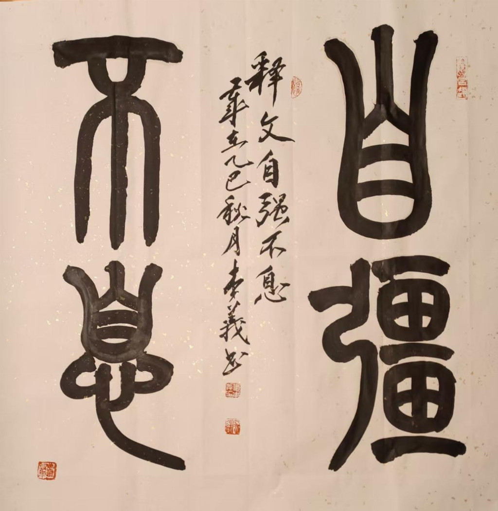 书法是娄本义艺术体系的坚实根基,尤以篆书成就最为突出。他取法峄山碑的立骨精神,参意泰山碑的庙堂气象,将金石味与书写性完美结合。其篆书线条圆厚饱满,字势如奔腾跃动,在严谨法度中透出生命激情,展现出“刚柔相济”的美学特征;行草则融王铎之跌宕与吴昌硕之苍茫,形成“直起直落、大开大阖”的笔势。深厚的书学修养反哺其绘画创作,使画作兼具“书写性笔意”与“结构性力量”,真正实现了“书画同源”的艺术理想。这种书画互鉴的融通理念,是其艺术达到“有法而无法”自由境界的关键。