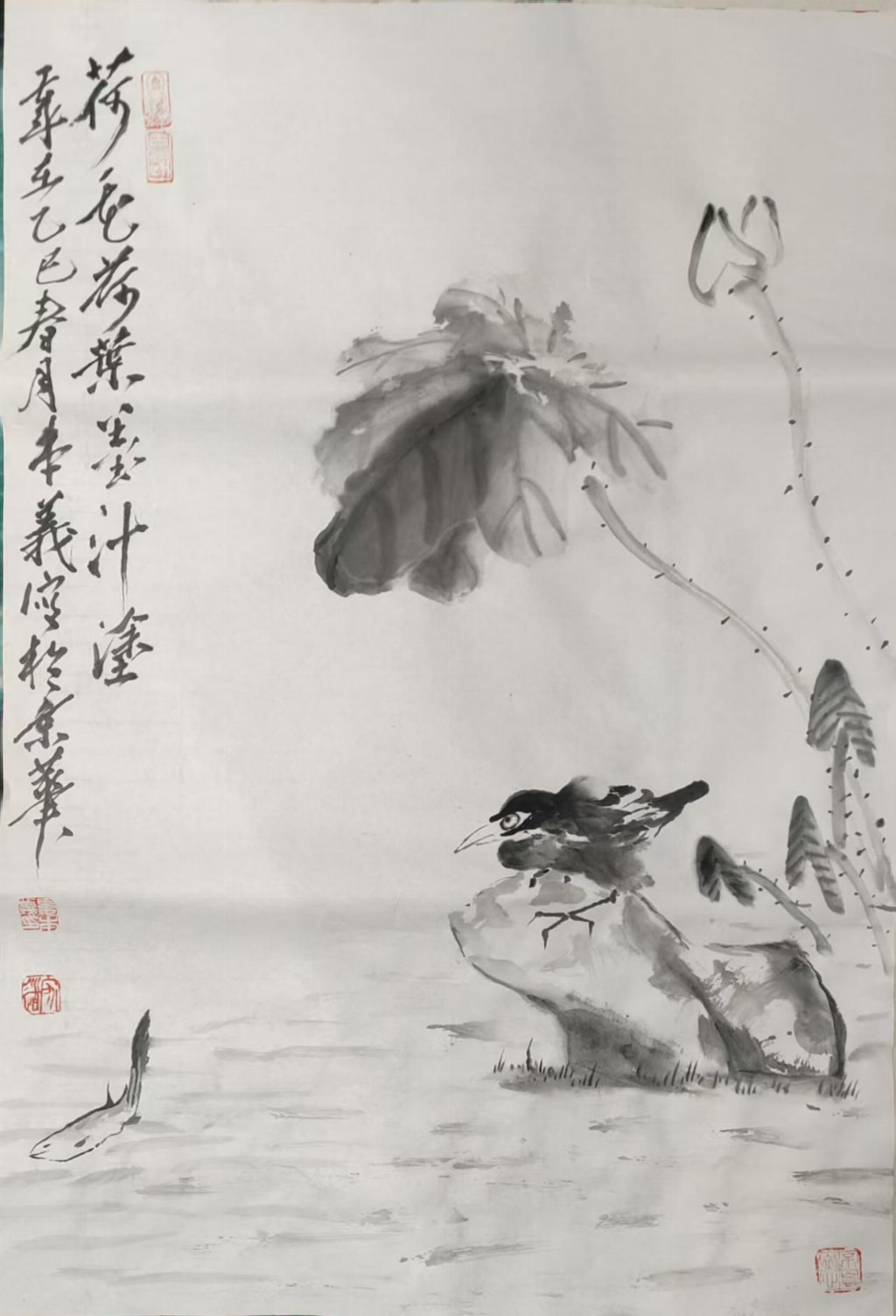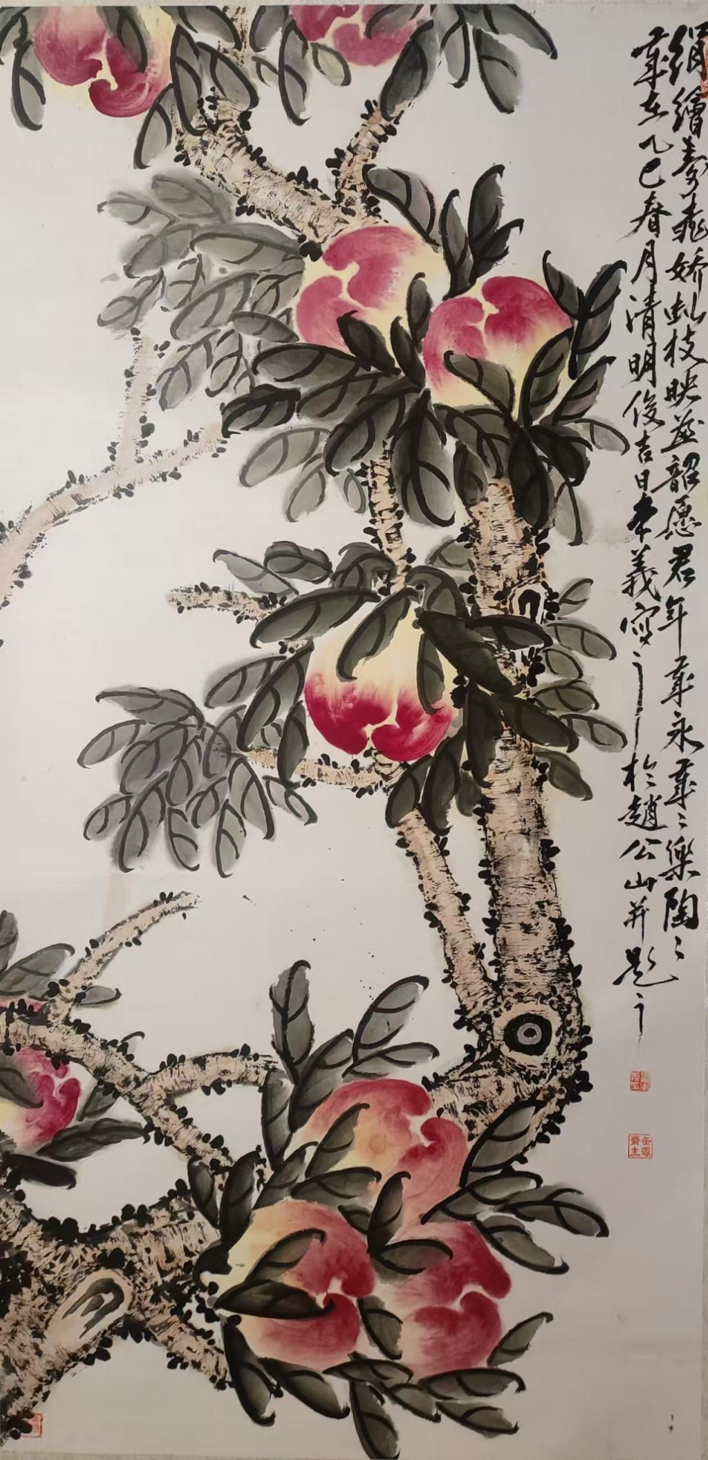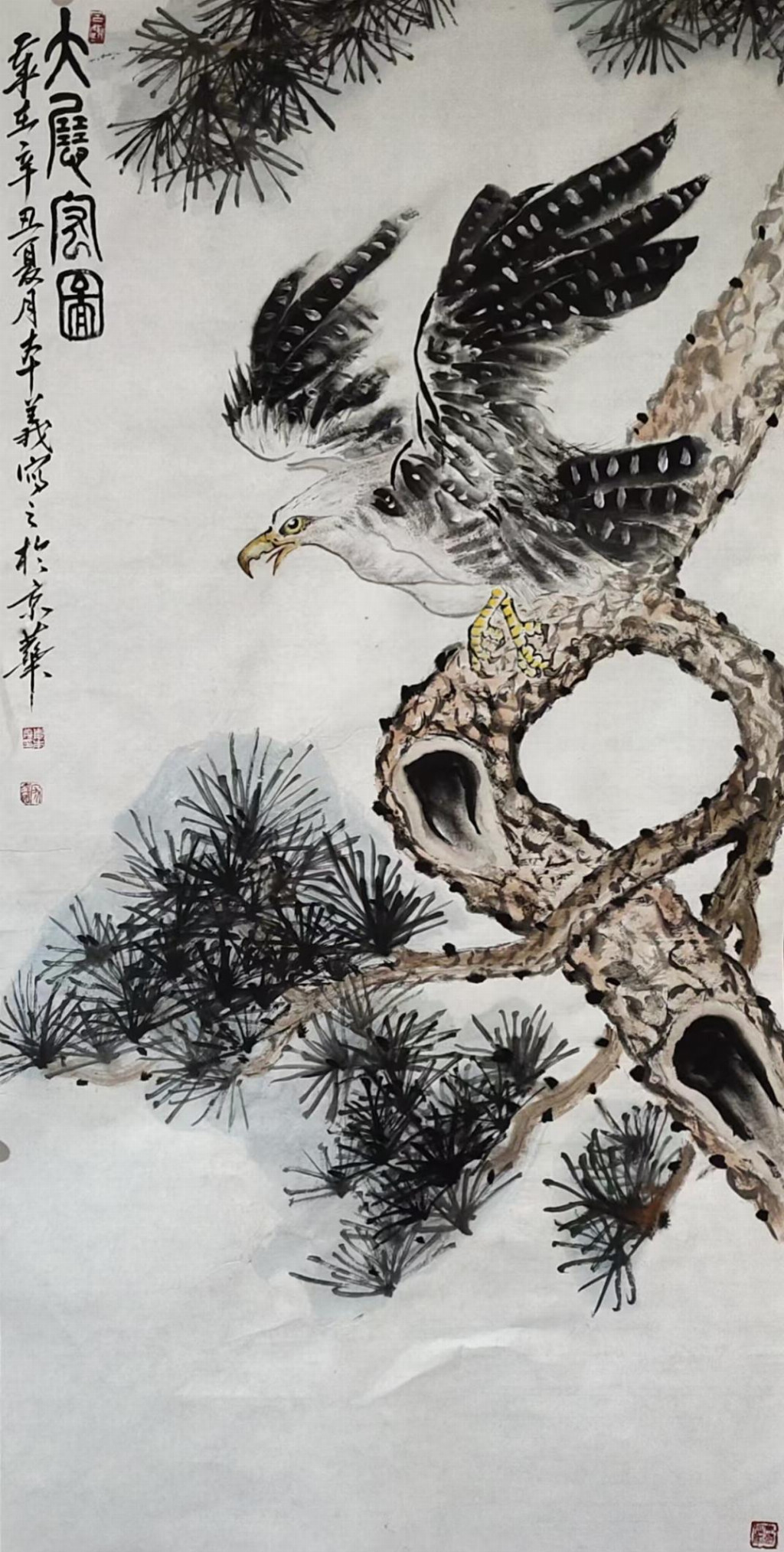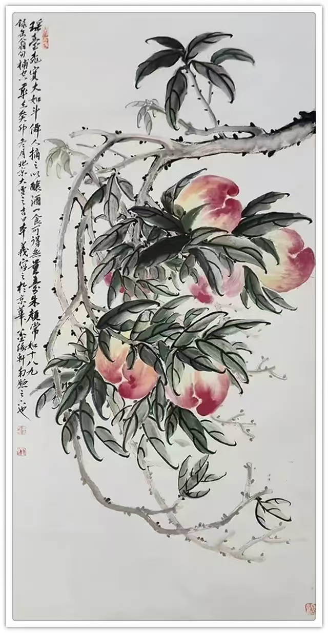 娄本义的花鸟画创作,深得吴昌硕“重、拙、大”笔墨精髓,又融入对自然生命的深刻体悟,展现出“墨彩交响”的独特魅力。其作品突破传统程式,在大气厚重中见细腻飘逸。例如,《瑶台仙桃》以35万元在苏富比成交,画面中桃实饱满,枝条如篆籀盘旋,胭脂与石绿交融,既显富贵气象,又透出仙逸之境;苍鹰系列则以焦墨勾勒锐目利爪,淡墨皴染羽翼层次,在静态中蕴含搏击长空的动势;墨荷系列更是其代表作,以篆籀笔法勾勒莲茎,金石味十足,并用破墨技法表现荷叶的浓淡干湿,色墨交融间营造出光影流动的自然幻境。他的仙鹤作品则尽显文人雅趣,白羽以留白技法表现,配以松石背景,构筑出“松鹤延年”的永恒意象。这些作品均实现了“形神兼备、物我两忘”的艺术升华,在灵动飘逸中不失厚重底蕴。