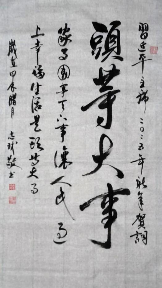 2023年入展中国国家画院美术馆主办的传薪•全国书画名家邀请展。入展雁栖湖《汉风唐韵 丝路万千》第一届国际文化节艺术名家作品展。入展中国楹联《水墨流觞蕴诗意 润雅如玉齐鲁风》新时代楹联书画名家邀请展。入展艺术之巅看中国·大美中华纽约时代广场海外展播。入展洛杉矶2023·大美中国·第八届中美书画名家作品展。入展中央美院廊坊馆《丝路艺术 共创繁荣》全国书画名家丝路艺术大展。入展北京民族文化宫展览馆江山如此多娇第四届当代艺术名家精品书画展。入展2023一带一路国际艺术巡展(匈牙利)。入展日本东京2023友爱和平中日书画名家邀请展。入展广州南北新象首届南北当代名家学术邀请展。应邀创作《中国梦》参加国家游泳中心(水立方)釉上星彩地面瓷绘集群展示项目并成功申创吉尼斯世界纪录。入选甲辰2024~唐忠球书法精品日历展。